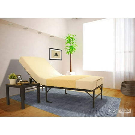 Pragma Everyday Bed-In-A-Box Wooden Slat Adjustable Bed Head Only, Multiple Sizes: Includes complete mattress support system and 6" memory foam mattressMattress uses high-density foam base layer for maximum supportEasy adjustment of head section to 10 different positionsFrame can be folded in half for easy, lightweight transportation and storageFeatures powder-coated steel with sleek black finishBeautiful birch wood slats for flexible mattress supportSupportive retainer keeps mattress from slippingBed base withstands up to 1600 lbs14" clearance for under-bed storageBed bug and dust mite resistantHypoallergenicMattress meets federal flammability standard CFR 1633Fits inside conventional bed frameBrackets available for headboard/footboard attachment (sold separately) Allow 24 hours for mattress to expand to its proper shape and sizeEasy to assemble