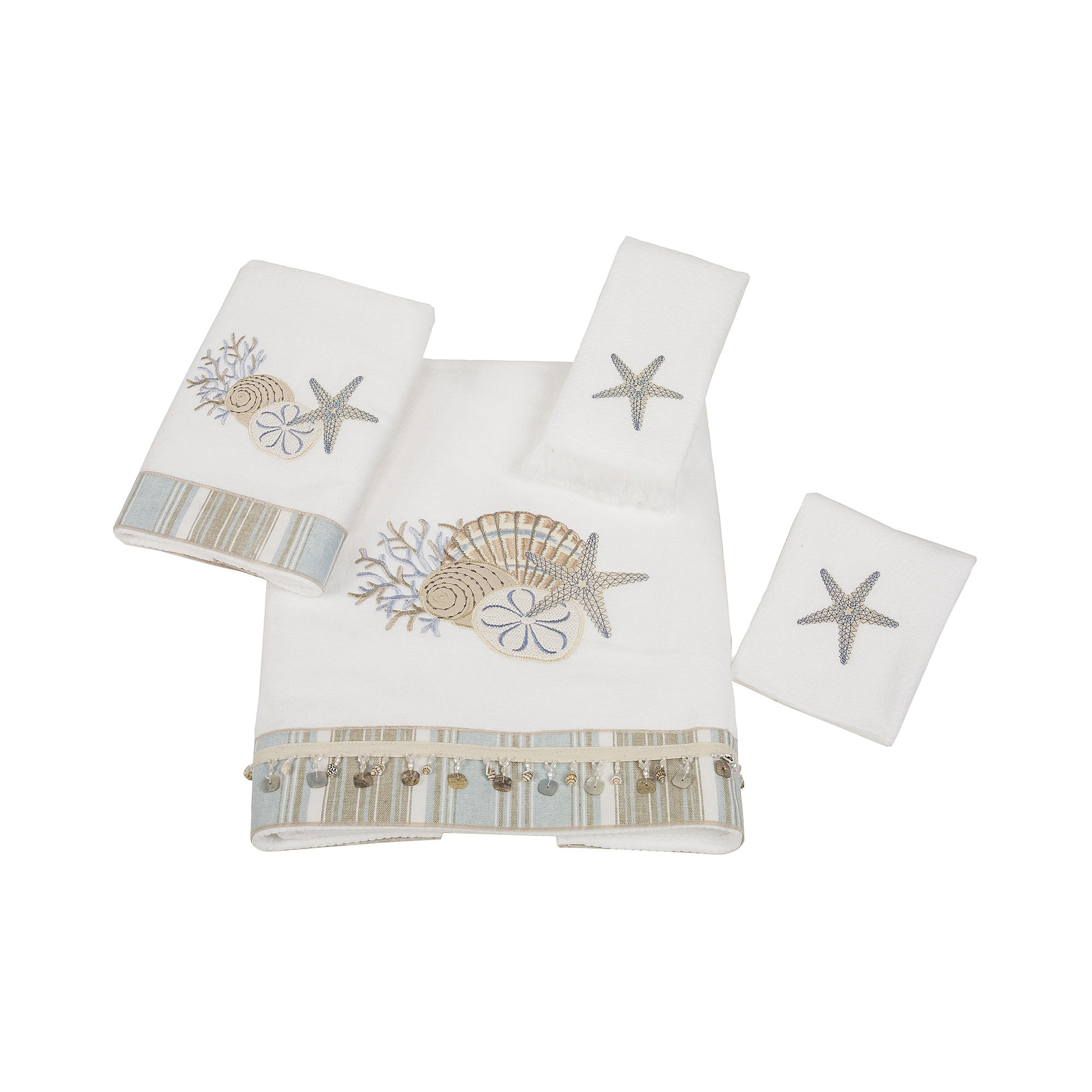 beautifully embroidered under-the-sea motif in subtle shades of blues and browns trimmed with a coordinating striped border use year-round for a fun seasonal look coordinating By the Sea bath pieces also available Bath towels include: Bath towel: 50x27" Hand towel: 30x16" Washcloth: 12x12" Fingertip towel: 18x11" Cotton
