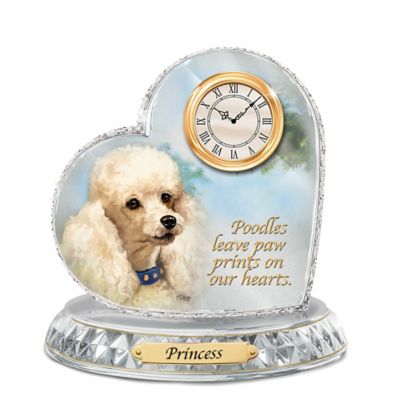 Best of all, it is engraved with your Poodle's name on a gleaming golden plaque for a one-of-a-kind celebration of your beloved pet.Expertly crafted of multi-faceted genuine crystal in an attractive, heart-shaped design, this limited-edition Poodle dog clock is accented with 22K gold bands and gleaming golden framing